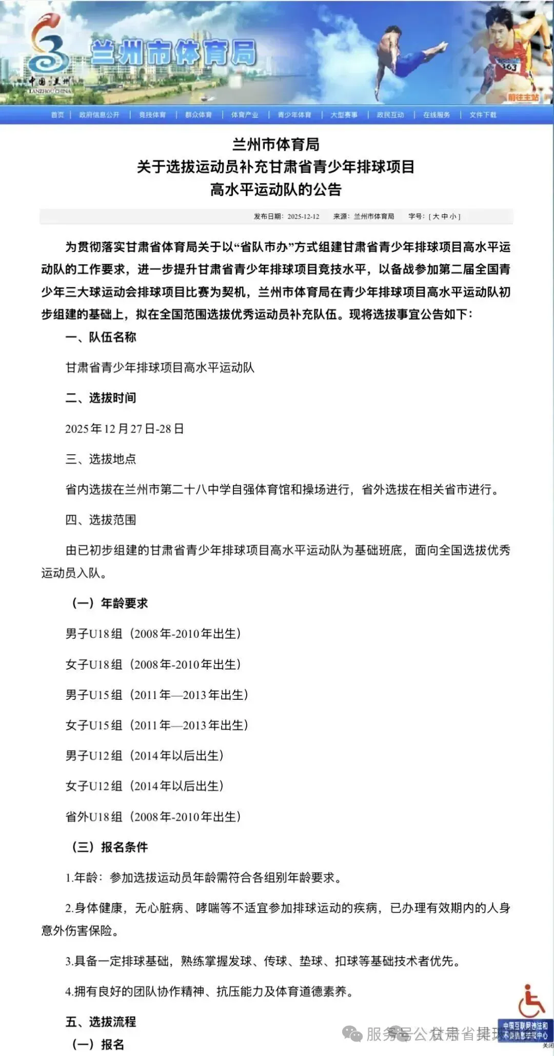 兰州市体育局关于选拔运动员补充甘肃省青少年排球项目高水平运动队的公告
