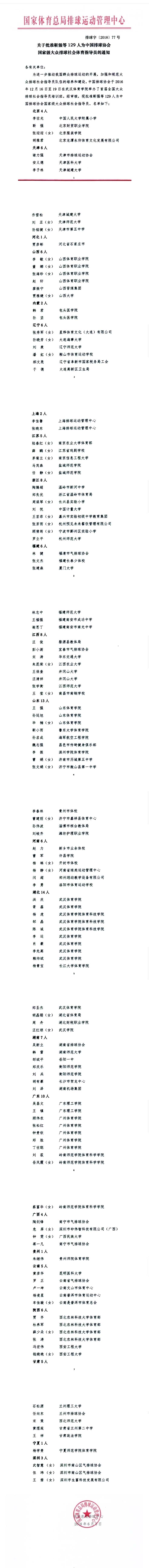 关于批准靳强等129人为中排球协会国家级大众排球社会体育指导员的通知